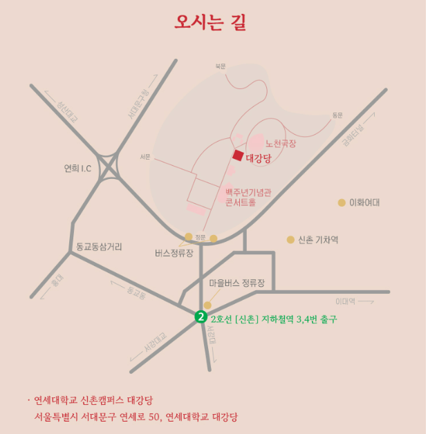 신촌에 위치한 연세대학교 대강당은 지하철 2호선 신촌역에서 내리시면 됩니다.