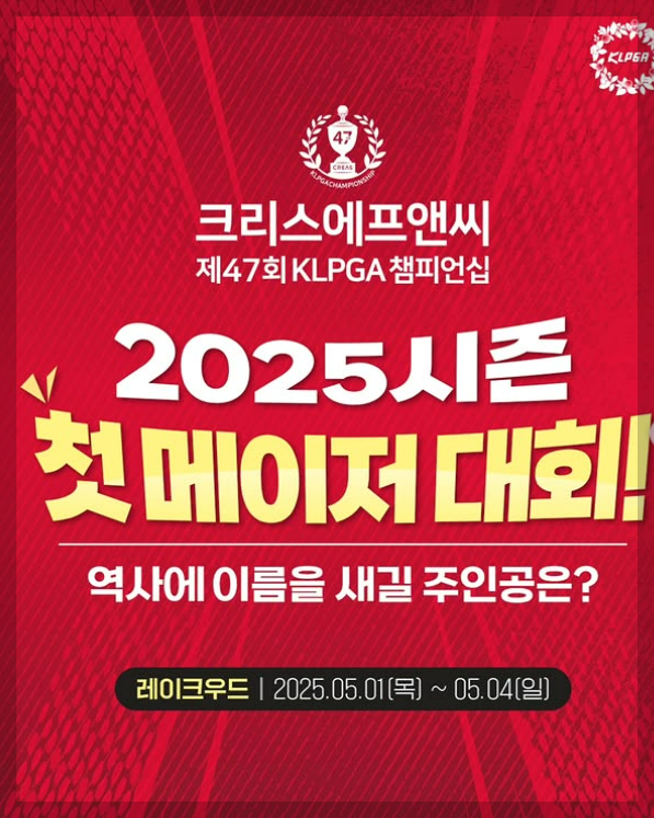 올해도 어김없이 찾아온 KLPGA의 메이저 대회, ‘크리스에프앤씨 제47회 KLPGA 챔피언십’이 2025년 5월 1일(목)부터 5월 4일(일)까지 경기도 양주 레이크우드 컨트리클럽에서 펼쳐집니다!